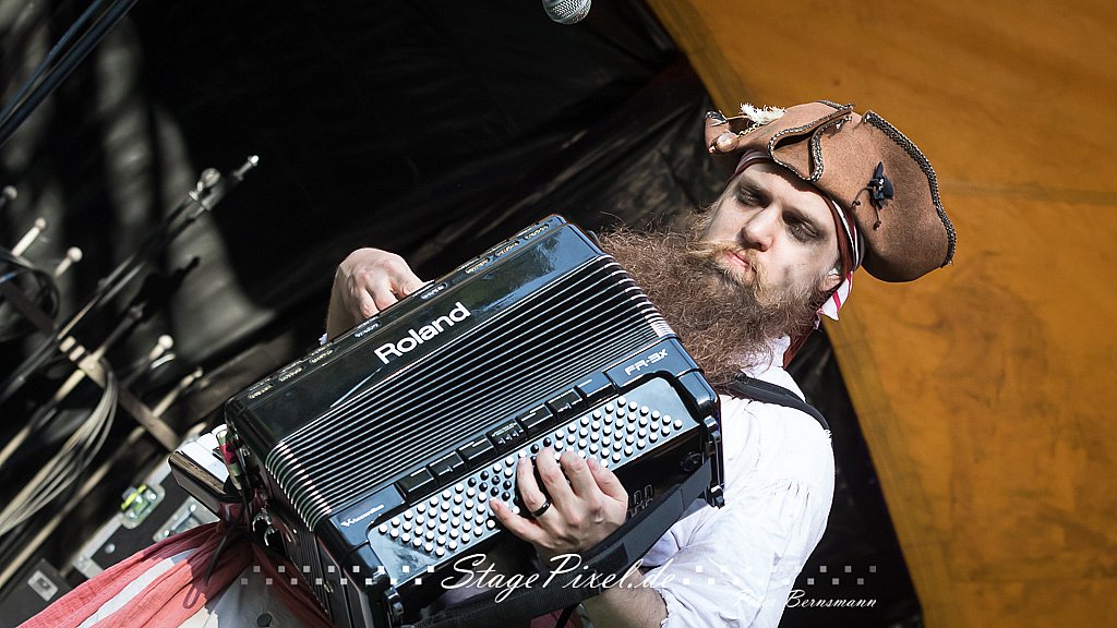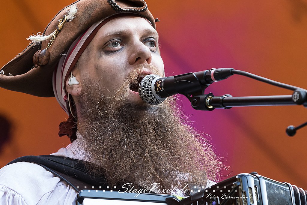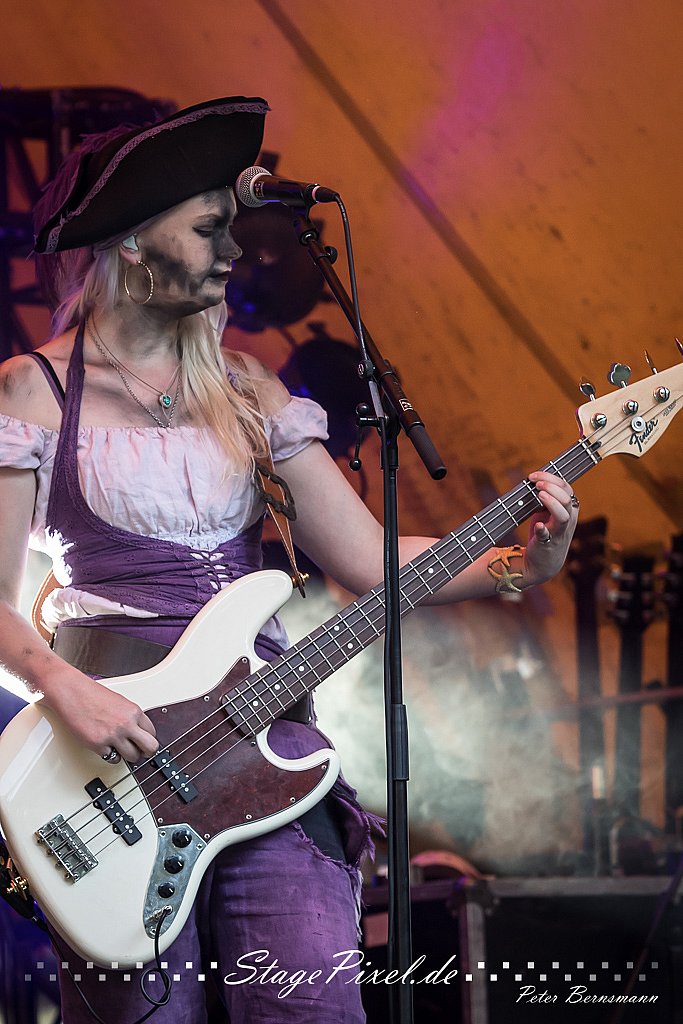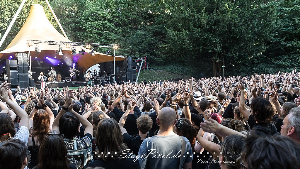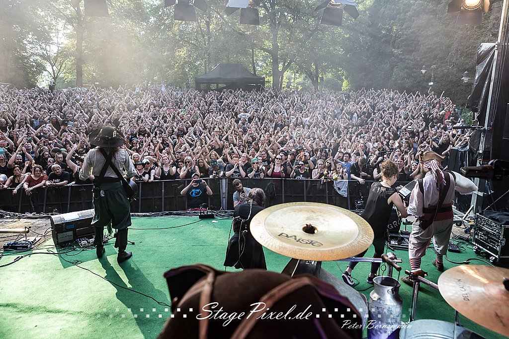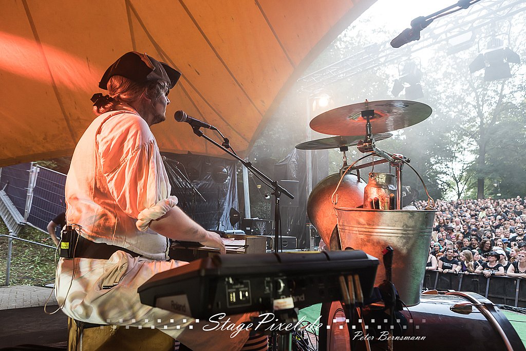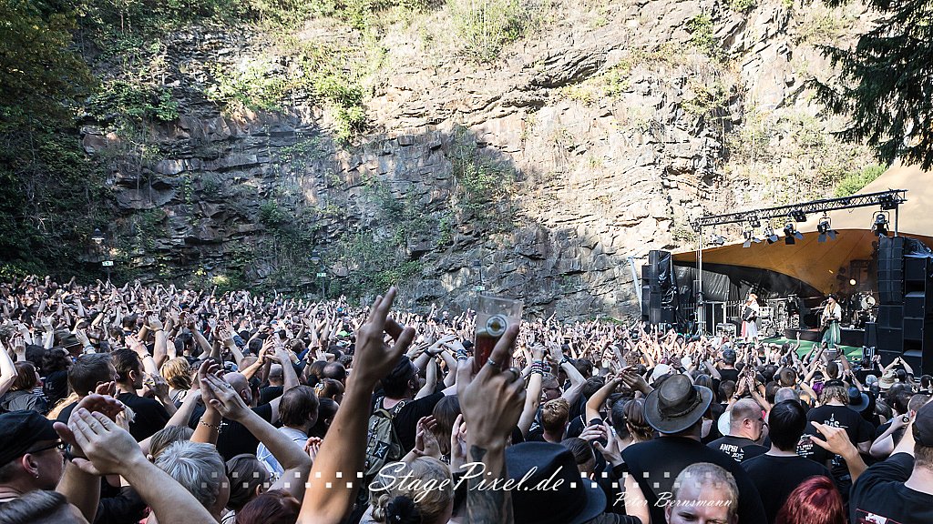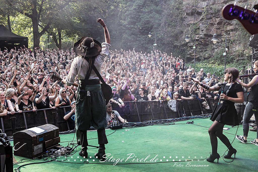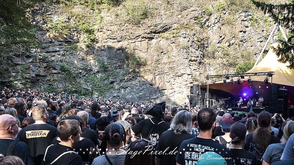 Das Feuertal Festival auf der Waldbühne Hardt in Wuppertal ist jedes Jahr im August ein beliebter Treff der schwarzen Szene. Bei ausverkaufter Veranstaltung feierten am 31.08.2019 rund 2.500 Fans bei bester Laune und schönstem Wetter. Lediglich ein Platzregen sorgte für eine kurze Unterbrechung der Veranstaltung, denn auf der Bühne sind nicht alle Flächen regensicher.