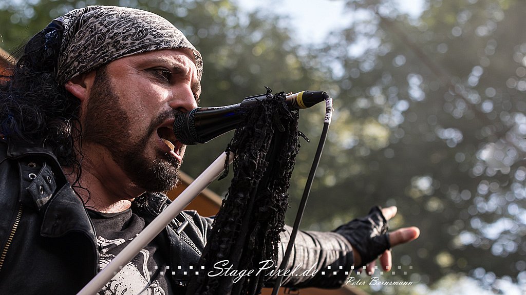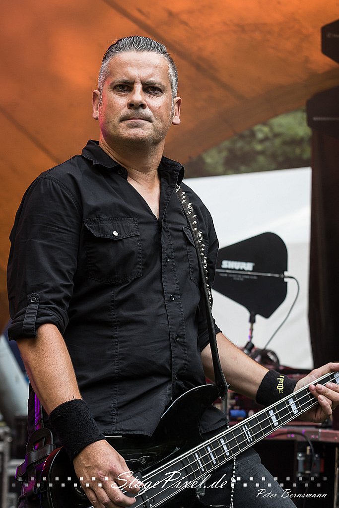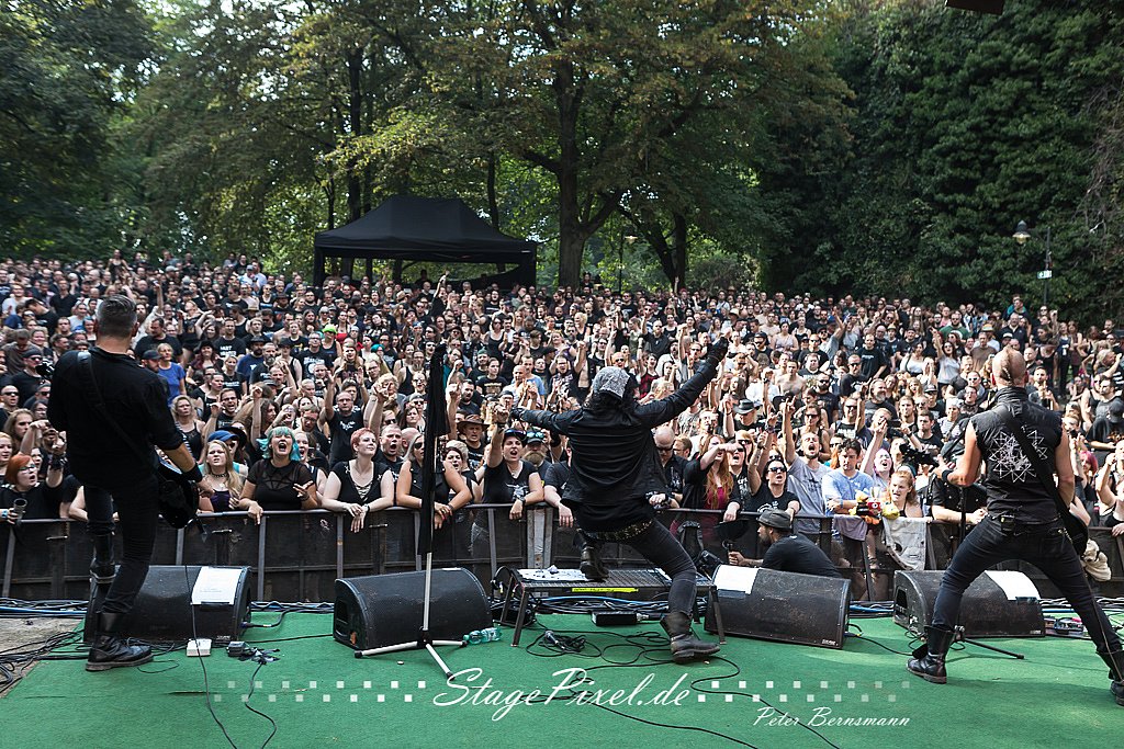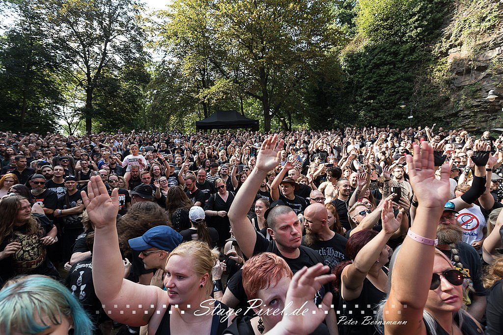 Das Feuertal Festival auf der Waldbühne Hardt in Wuppertal ist jedes Jahr im August ein beliebter Treff der schwarzen Szene. Bei ausverkaufter Veranstaltung feierten am 31.08.2019 rund 2.500 Fans bei bester Laune und schönstem Wetter. Lediglich ein Platzregen sorgte für eine kurze Unterbrechung der Veranstaltung, denn auf der Bühne sind nicht alle Flächen regensicher.